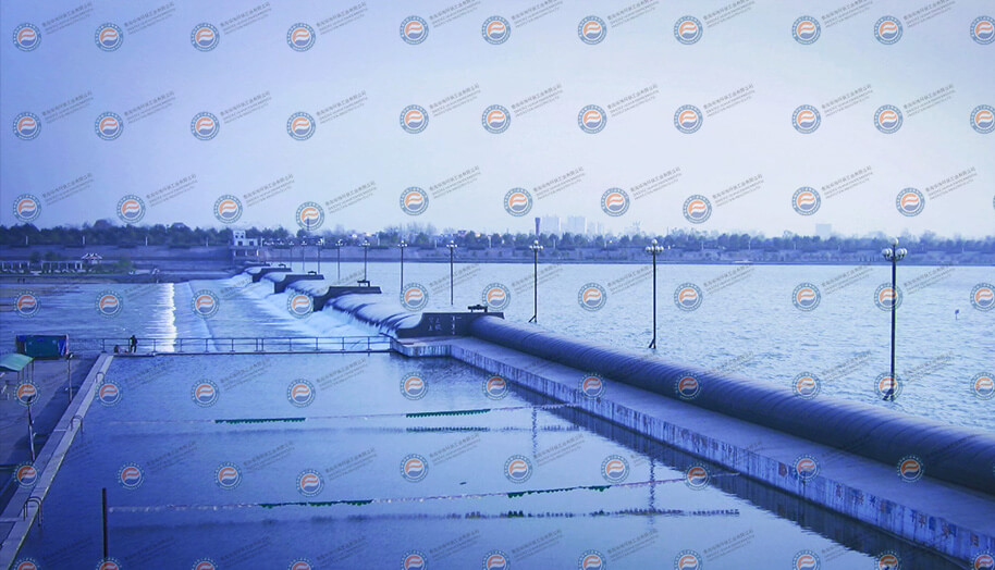橡胶坝,又称橡胶水闸,其用高强度合成纤维织物做受力骨架,内外涂覆橡胶作粘结保护层,按要求的尺寸加工成胶袋,用螺栓、压板等锚固构件将其锚固在混凝土底板上。底板下面需预埋充排水管道,需要拦水时,通过控制系统向橡胶坝坝袋内充水,充到一定高度形成挡水坝;不需要挡水时,泄空坝袋内的水,恢复原有河渠的过流断面,不影响河道泄洪。